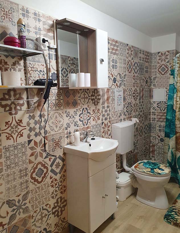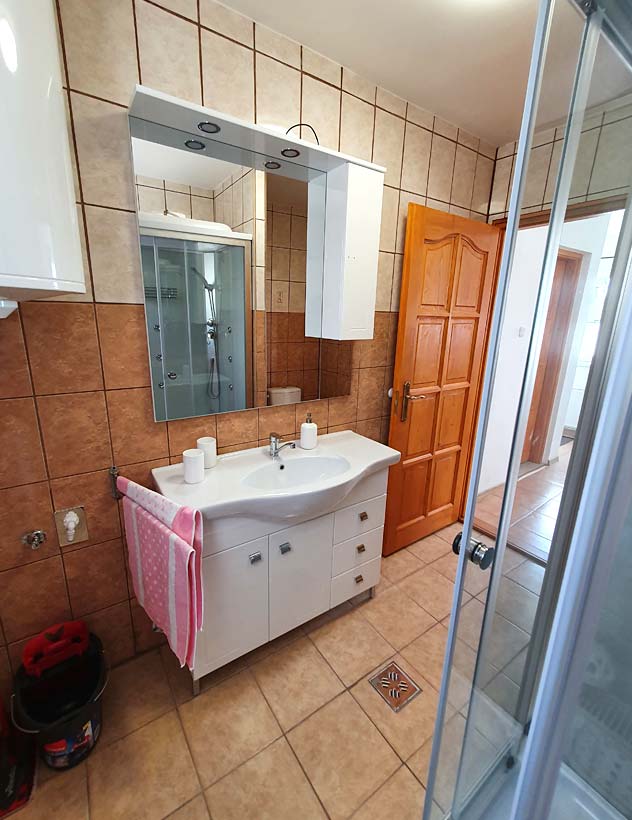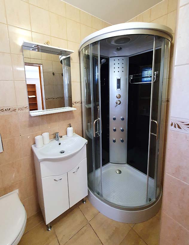 A főépület földszinti részén található egy hálószoba, melyben 2 db (összetolható) heverőt helyeztünk el. Igény szerint ez a szoba 1 pótággyal bővíthető, vagy szintén igény szerint babaágy is elhelyezhető itt. A hálószoba smart TV-vel, WIFI-vel, légkondicionálóval felszerelt. Közvetlenül a hálószobából nyílik a fürdőszoba, melyben masszázs zuhanyzót találsz.