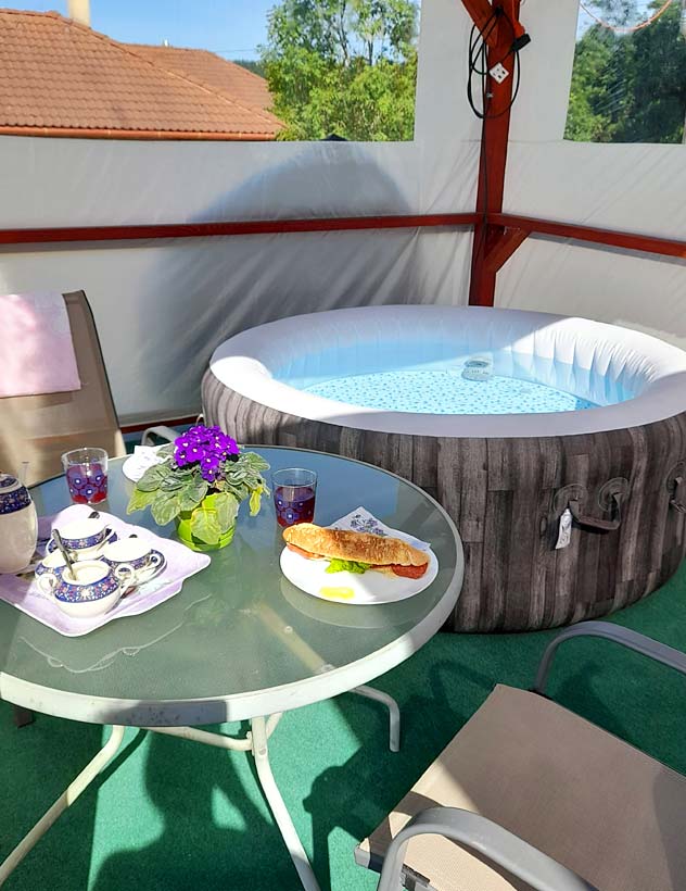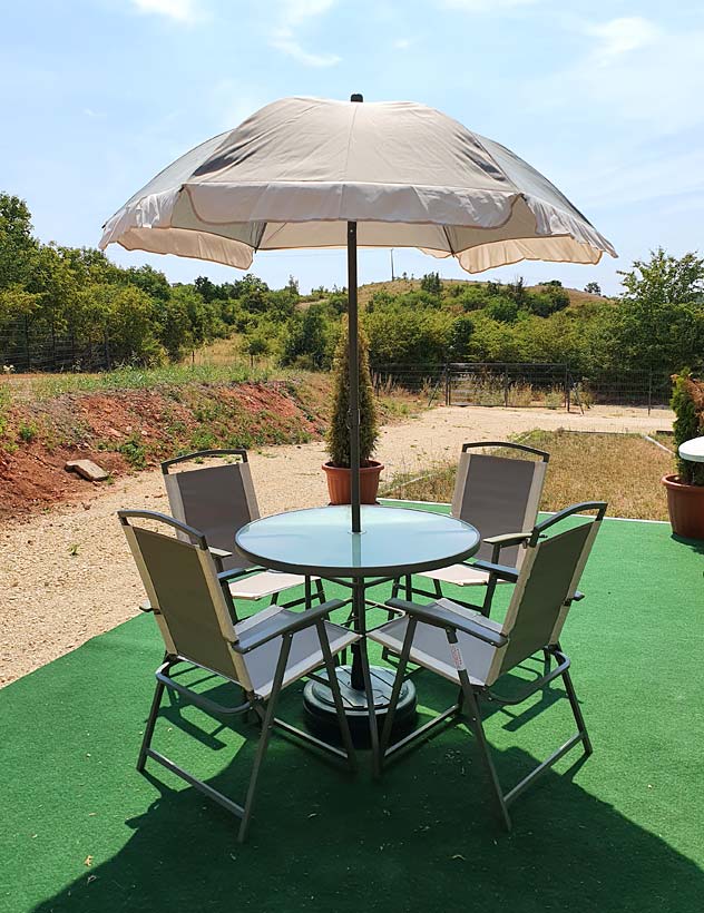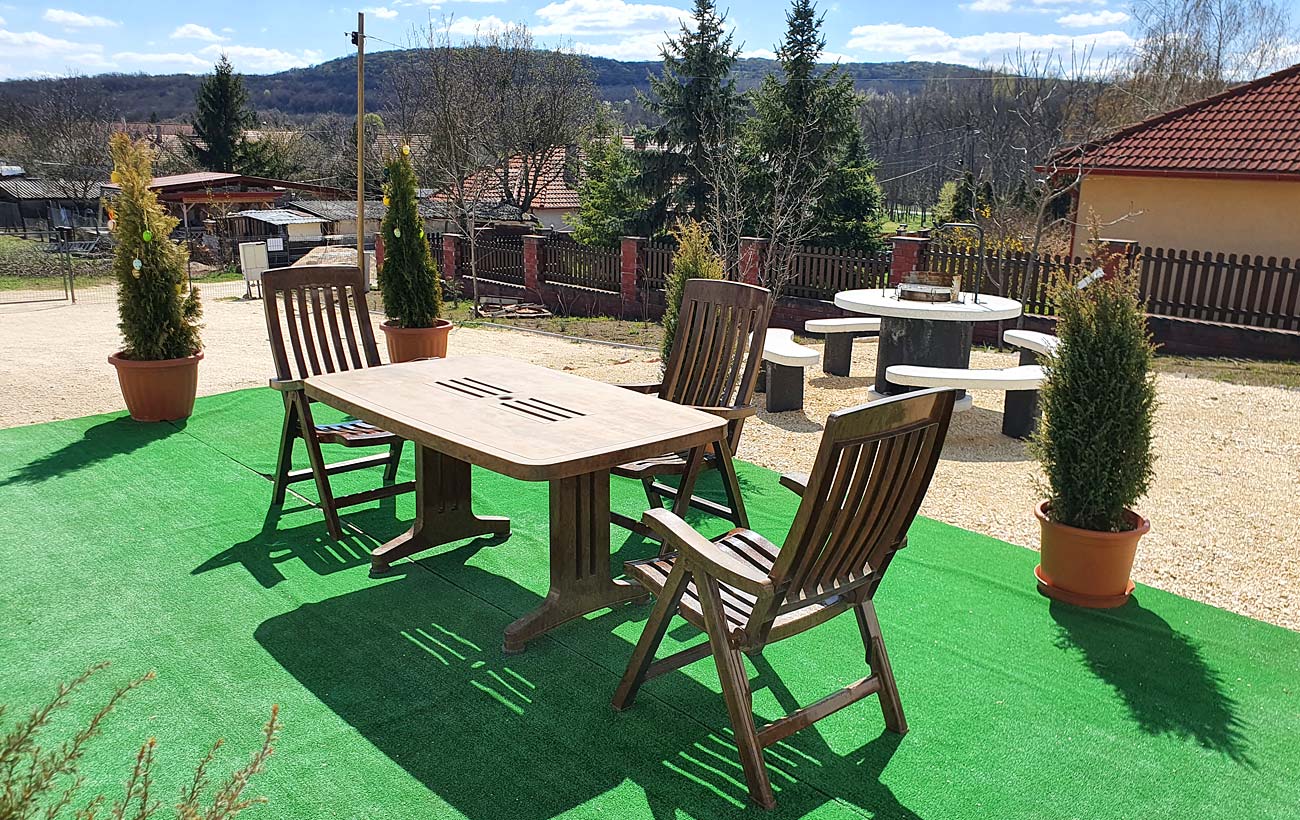 A vendégház dél-nyugati oldalán egy 32 m2-es terasz szolgálja vendégeink pihenését. Ezen a teraszon együtt élvezhetik a bográcsban főzés, vagy a rostélyon sütés, vagy akár a szalonnasütés közös élményét. A szükséges eszközöket biztosítjuk (bogrács, szalonnasütő pálca, tárcsa, gyújtós, tűzifa, stb.). Szintén a teraszon került kialakításra egy fedett, szélvédett szaletli a soft jakuzzi részére, melyet vendégeink külön díj nélkül használhatnak, május 15-től, szeptember 15. (egyéb időpontban a jakuzzi használata külön díjjal jár).